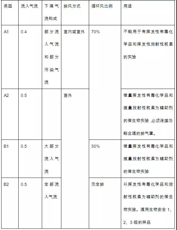 Ⅱ級(jí)安全柜按排放氣流占系統(tǒng)總流量的比例及內(nèi)部設(shè)計(jì)結(jié)構(gòu)分為A1、A2、B1、B2四種類型。