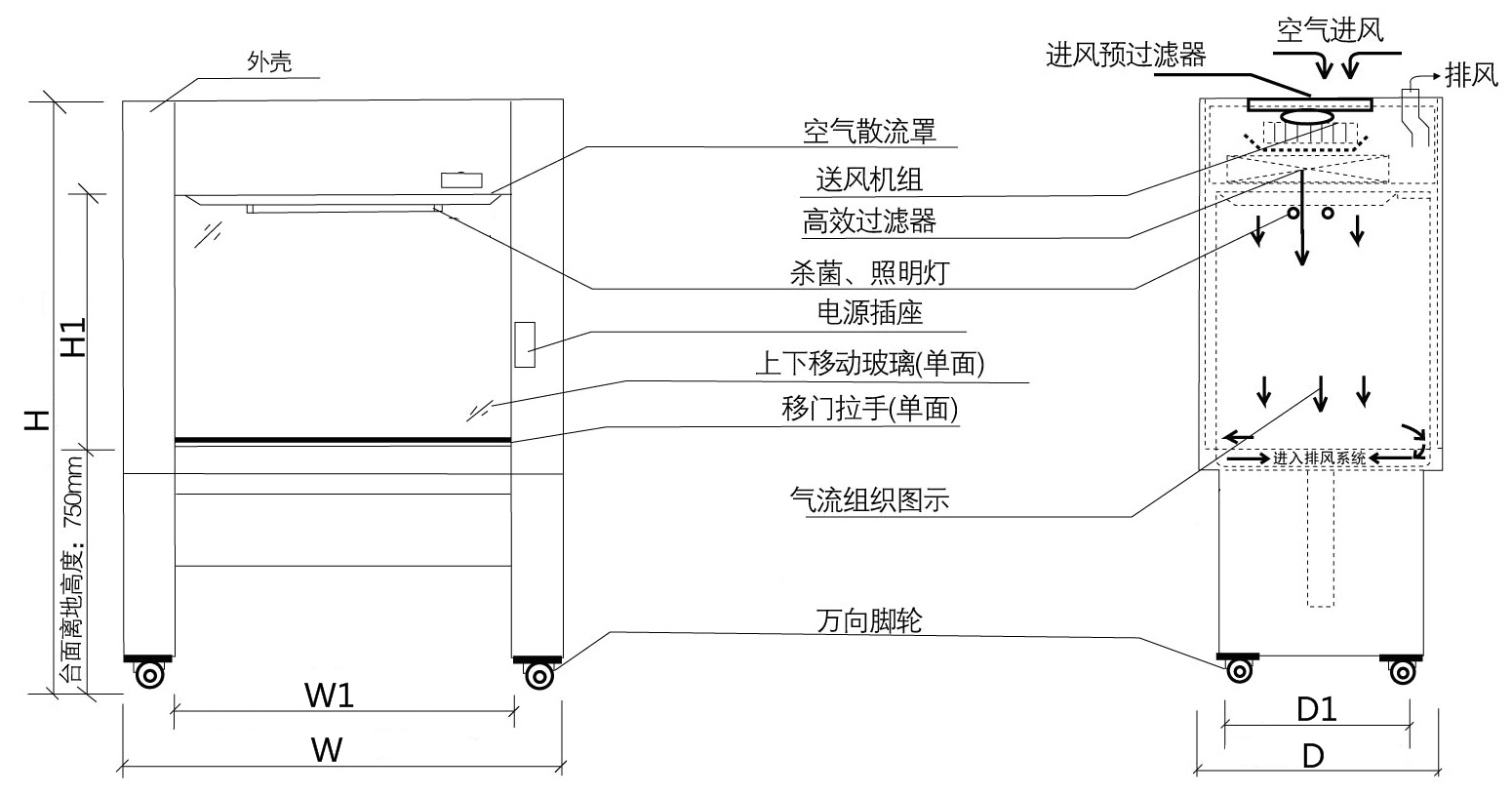 1、全循環(huán)式氣流設(shè)計(jì),當(dāng)工作區(qū)大量補(bǔ)充新風(fēng)時(shí),開啟排風(fēng)口。